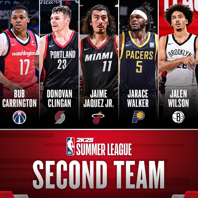 最佳阵容二阵:包括奇才的卡尔顿-卡林顿、开拓者的多诺万-克林根、热火的小海梅-雅克、步行者的贾拉斯-沃克、篮网的杰伦-威尔逊。