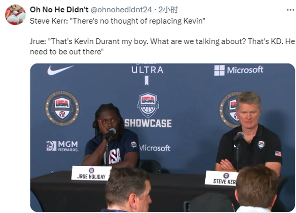 霍乐迪则回应记者:那可是凯文-杜兰特,我的兄弟。我们在说什么呢?那是KD,他应该在场上。