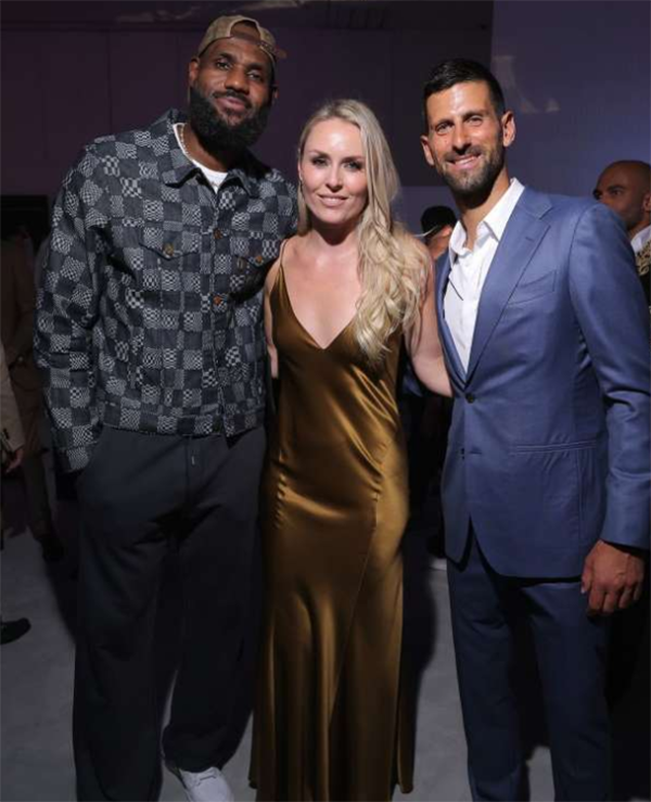 39岁的詹姆斯身穿深色长裤、格子外套、反戴棒球帽帅气出席活动,双手抄兜面带笑容,与塞尔维亚网球运动员德约科维奇合影。