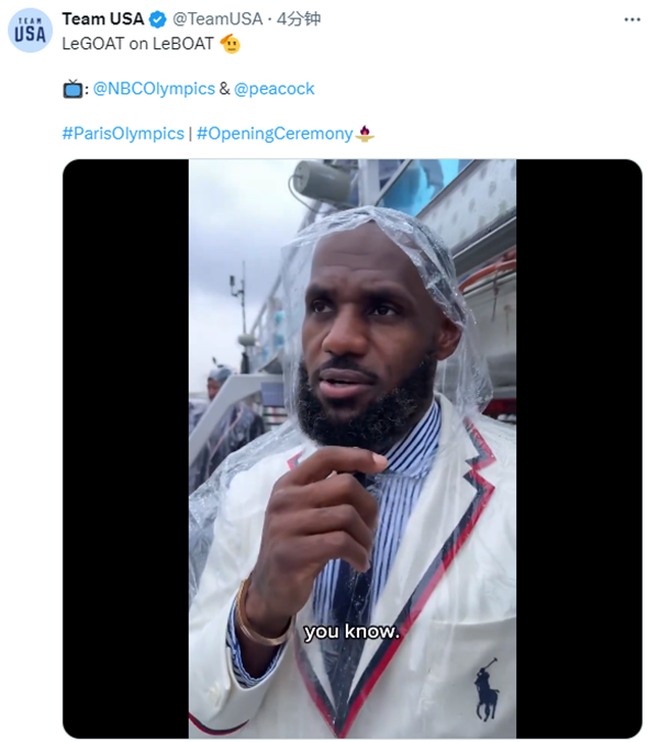 巴黎奥运会的开幕式是在户外举办的,奥运历史首现,这种开幕式很特别,但当地的天气不好,美国代表团亮相时,塞纳河下起了大雨,虽然詹姆斯身上穿着雨衣,但他早早把雨衣从头上拿掉,淋着雨举旗亮相,美国代表团其他人同样冒雨亮相。