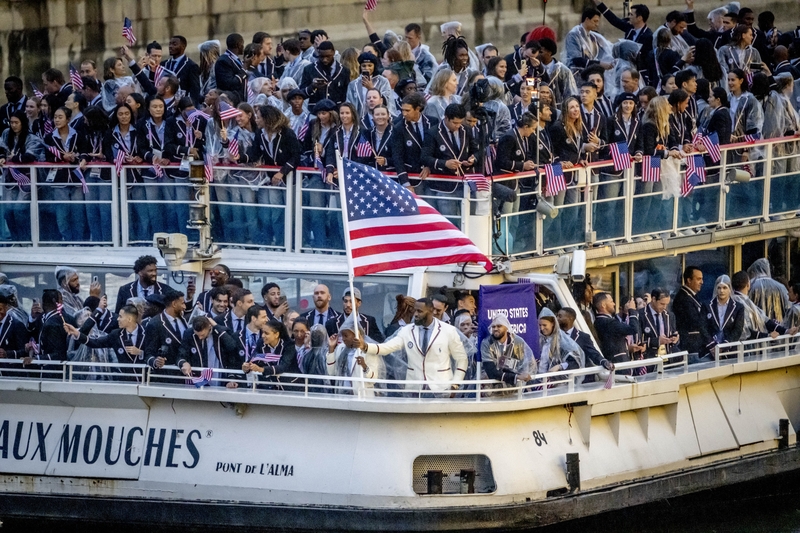 205个奥运代表团按顺序出场,塞纳河畔聚集了几十万人,美国奥运代表团倒数第二个乘坐游船亮相,篮球运动员勒布朗-詹姆斯和网球运动员可可-高芙担任旗手,39岁的詹姆斯身穿牛仔裤和白色西装,身披雨衣与高芙一起举着美国国旗。