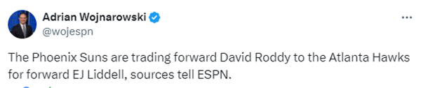 23-24赛季常规赛,罗迪为太阳出战17场,场均上场3.7分钟得到1.3分;利德尔为鹈鹕出战8场,场均2.9分钟得到0.5分,利德尔是在今夏德章泰-穆雷的交易中被鹈鹕送到老鹰的,现在他又被老鹰送到太阳。