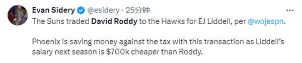 太阳1换1调整阵容,送走罗迪换来利德尔;24-25赛季,罗迪的薪资为280万美元,利德尔年薪则为210万美元,据报道,通过这笔交易,太阳节省一笔奢侈税,因此利德尔的年薪比罗迪的少70万美元。
