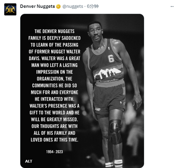 掘金官方也声明追悼沃尔特-戴维斯,听到沃尔特-戴维斯去世的消息,丹佛掘金大家庭十分悲痛,沃尔特是一个伟人,他给球队留下了深刻的印象,继续影响每一个人,在这个时刻,我们与他们的家人同在。