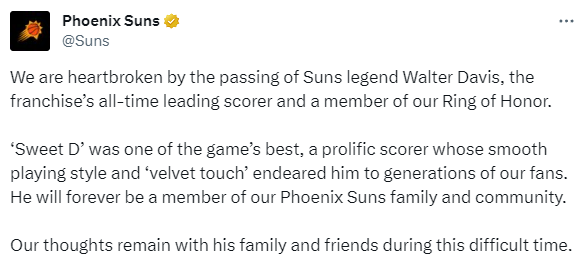 太阳官推声明:我们为太阳队传奇人物沃尔特·戴维斯的离世感到心碎,他是球队历史上得分最多的球员,也是我们荣誉戒指的一员。“Sweet D”是队史最好的球员之一,他是一个多产的得分手,他流畅的球风和“天鹅绒般的触感”使他深受一代又一代球迷的喜爱。他将永远是菲尼克斯太阳队大家庭和社区的一员。在这艰难的时刻,我们与他的家人和朋友同在。