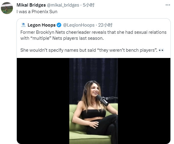 现在的篮网啦啦队长辟谣,她表示:“我是布鲁克林人,自2017年以来我一直在这支球队,并在过去的四个赛季担任队长。我不知道她是谁,但她在过去7年里绝不是我们的一员,而且绝不可能有现在的球员参与其中。