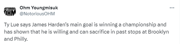此外泰伦-卢还表示哈登在篮网和76人生涯都证明了他愿意且能够做出牺牲。卢指导还表示他已经与哈登和PJ-塔克讨论了进攻问题,但到现在为止,他们之间并未真正意义地讨论球队的防守。