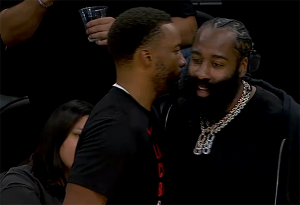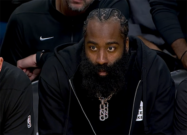 快船新援哈登因恢复状态而无缘出战洛城德比,哈登身穿黑色连帽卫衣、戴着大金链子坐在快船替补席观战,镜头频频给到他。