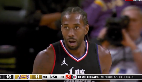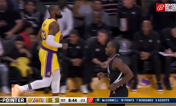 洛城德比正式开打,快船巨头小卡的手感十分火热,开场两记中投稳稳命中,之后迎着詹姆斯轰进三分球,手感滚烫连中三分,见状浓眉挺身补防大帽小卡,小卡投篮不成还反抢被吹犯规;在小卡的带领下,快船领先占上风。