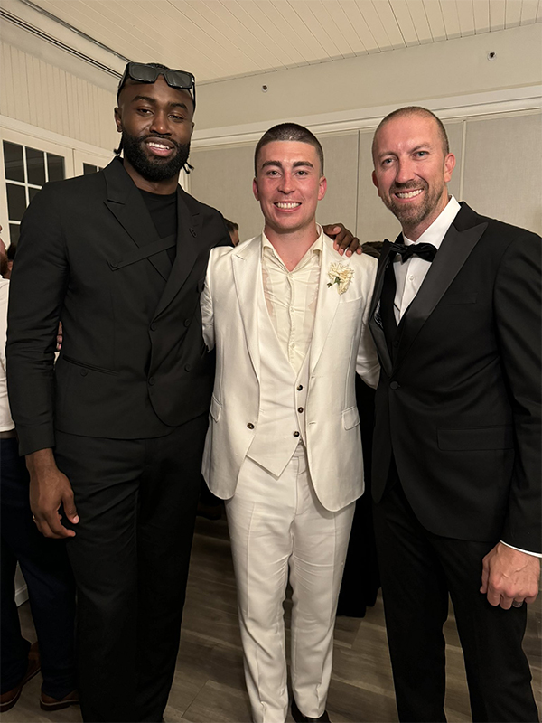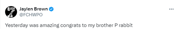杰伦-布朗发推祝贺普里查德大婚,写道:昨天真是太棒了,恭喜我的兄弟;布朗不仅晒出他盛装出席以及与普里查德的合影,还晒出格里芬为普里查德夫妇主持婚礼的画面,引得现场众人开怀大笑。