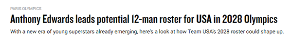 NBA官网预测的美国队12人名单(括号内为2028年球员的年龄)——安东尼-爱德华兹(27岁)、杰森-塔图姆(30岁)、巴姆-阿德巴约(31岁)、保罗-班切罗(25岁)、德文-布克(31岁)、米卡尔-布里奇斯(31岁)、杰伦-布朗(31岁)、坎宁安(26岁)、达龙-福克斯(30岁)、切特-霍姆格伦(26岁)、小贾伦-杰克逊(28岁)和德里克-怀特(34岁)。