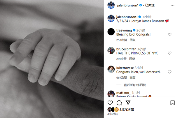 婚后一年,布伦森夫妇都官宣他们的第一个孩子出生,这是他们的爱情结晶,东契奇、特雷-杨都恭喜布伦森。