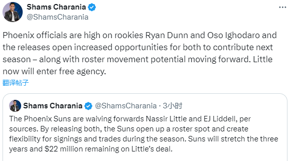 名记shams报道,通过裁掉利特尔和利德尔,太阳队将腾出一个球员名额,并为赛季期间的签约和交易创造灵活性;太阳此举也为两大新秀莱恩-邓恩(2024年28号秀)和奥索-伊戈达罗(2024年次轮10号秀)在新赛季获得更多的上场机会,太阳官方对他们的评价很高。