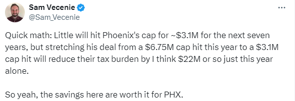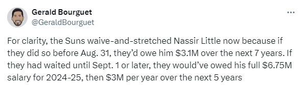 利特尔的合同还剩余3年2200万美元,太阳队使用延伸条款裁掉了利特尔,据记者EvanSidery报道,未来7年,太阳每年向其支付310万美元。