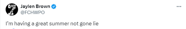 来源:JRS直播网08-23 11:25JRS直播网讯 北京时间8月23日,新科FMVP杰伦-布朗发推写道:我的这个夏天真的很美妙,没骗你。