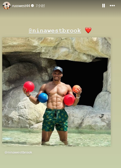 威少的妻子妮娜晒出威少站在水中赤裸上身的帅照,威少的八块腹肌十分醒目,妮娜配文写道:“一个父亲的身材”。