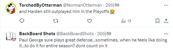 拉特利夫夸赞乔治并且点名哈登不防守引争议,美球迷表示哈登在季后赛的表现仍旧比他好;还有球迷表示乔治的防守确实很棒,当他想这样的做的时候,但是别指望他整个赛季都卖力防守。