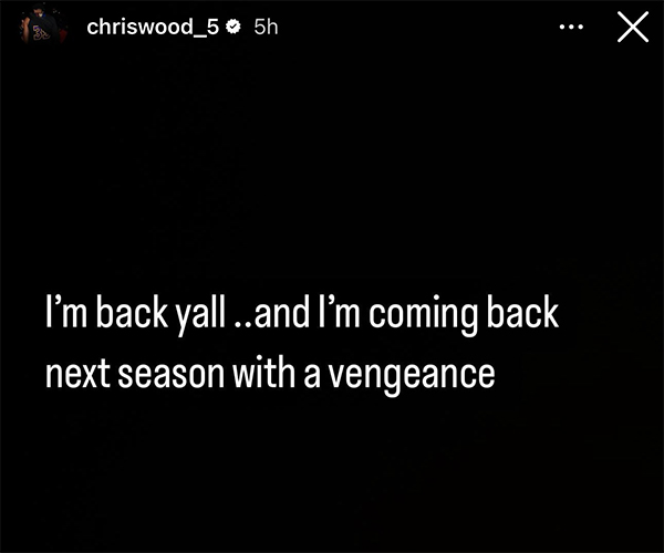 来源:JRS直播网08-25 13:30JRS直播网讯 北京时间8月25日,湖人球员克里斯蒂安-伍德更新动态,公开透露新赛季的目标,表示:跟你们说,我回来了,新赛季我将为复仇而回归。