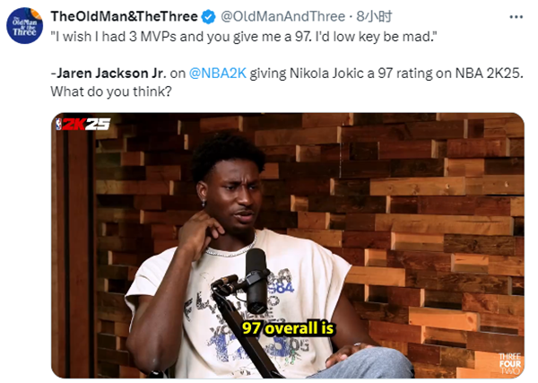 约基奇2K24能力值98为联盟独一档,2K25能力值97并列联盟第一,不过对于约基奇的新能力值,灰熊球员小贾伦-杰克逊表示:约基奇拿了三次MVP,结果评分才97?我要是拿了三次MVP,然后给我97分,我肯定会很生气。