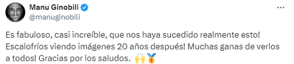 来源:JRS直播网08-29 12:34JRS直播网讯 北京时间9月29日,阿根廷男篮奥运夺冠功臣、马刺名宿马努-吉诺比利晒照怀念夺金20周年,发推写道:这真的发生在我们身上,真是太棒了,几乎令人难以置信!20年后看照片我仍然会起鸡皮疙瘩!等不及要见到你们所有人!谢谢你们。