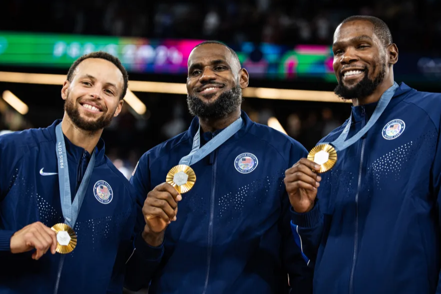 今年巴黎奥运会,库里首发出战全部6场比赛,场均拿到14.8分3.2篮板2.5助攻,场均得分为美国队最高,在半决赛和决赛两场关键比赛中,库里两战总共命中17记三分并且轰下60分,帮助美国男篮惊险夺冠,库里圆梦巴黎,获得生涯第一枚奥运金牌。