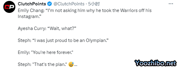 Emily Chang在采访中提问:我不是问他为什么在Ins简介中删除勇士信息。听到这个话题后,阿耶莎一脸疑惑,并且表示:等等,什么?库里夫妇大笑,库里表示:我只是很自豪能夺得奥运金牌而已。