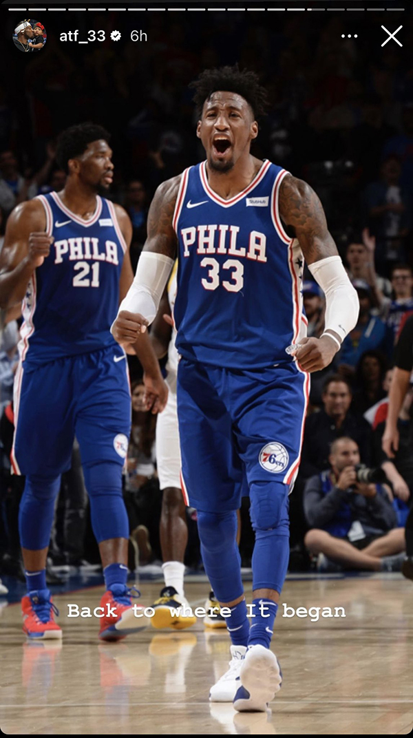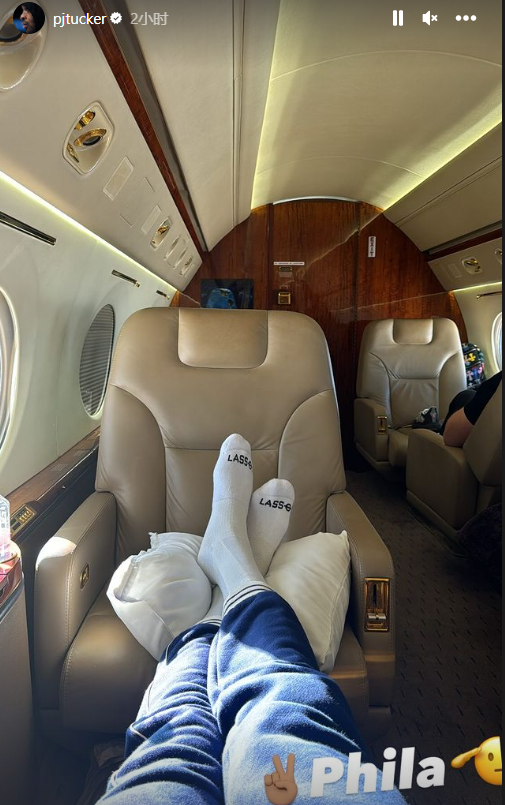 前76人球员PJ-塔克晒乘坐飞机照,配文写道:费城#敬礼。