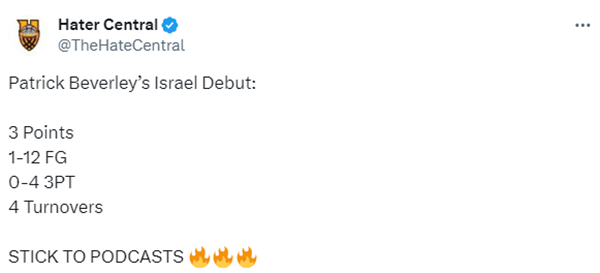 贝弗利在以色列联赛的首秀引热议,美媒晒出他的糟糕数据并且表示:你还是继续做播客吧;美媒Basketball Forever则表示贝弗利在特拉维夫哈普尔的表现太不好了。