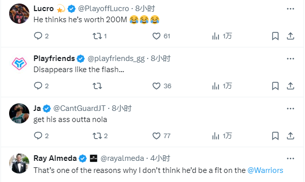 莺歌缺席球队训练营引热议,有球迷表示他们整个休赛期都试图交易他,换成我我也不会参加;有球迷表示这也是他不适合勇士的原因,在交易截止日前,他会被交易离队的;还有球迷嘲讽英格拉姆认为自己值得2亿美元,更有球迷直言滚出新奥尔良。