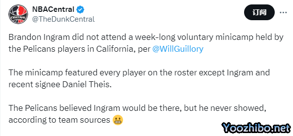 据美记Will Guillory报道,上周,英格拉姆没有参加鹈鹕在加利福尼亚举行的为期一周的迷你训练营,鹈鹕队相信英格拉姆会去参加该训练营,鹈鹕希望锡安、英格拉姆、麦科勒姆和新援穆雷能在训练营中首次合体,但他始终没有出现。