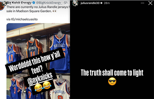 2019年尼克斯交易波尔津吉斯时,后者曾在社媒上发声表示:真相终将会水落石出(随后秒删动态);如今兰德尔回应主场球馆商店没有自己球衣一事引热议,美媒NBACentral表示:看起来兰德尔正在向尼克斯队传递一个信息。