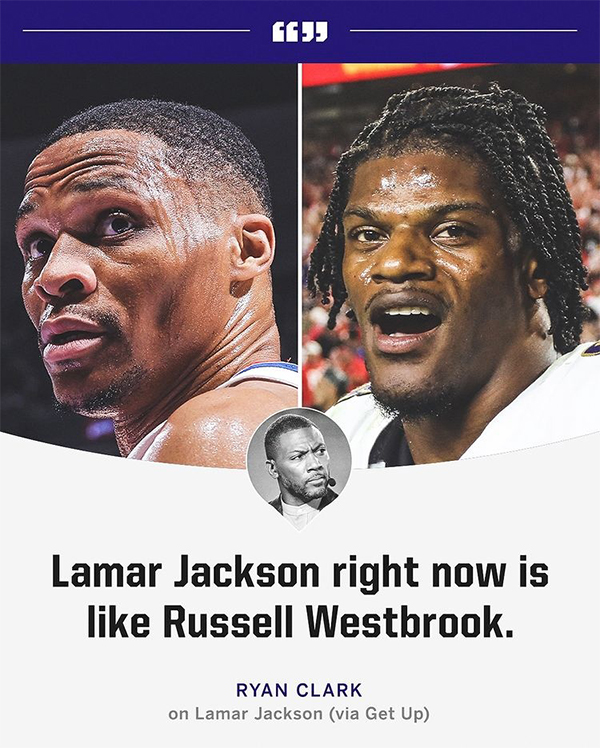 NFL赛季揭幕战堪萨斯城酋长击败巴尔的摩乌鸦。赛后ESPN分析师、前NFL球员瑞恩-克拉克分析了比赛,他表示:现在的拉马尔-杰克逊就像威斯布鲁克。我们看了威斯布鲁克在整个常规赛中的表现,甚至在季后赛他的数据也很好看,对球队的表现有巨大的影响。但你还记得他和达米安-利拉德正面交锋的时候吗?事情变得情绪化,威少无法命中投篮。每次他空位出手,他都打在篮筐的后沿上,它不会进篮筐。利拉德做了什么?利拉德会侧身一步,投中三分,然后挥手告别。这就是现在拉马尔-杰克逊和马霍姆斯之间的区别。