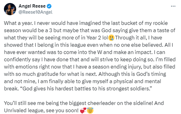 安吉尔-里斯发推写道:多么不平凡的一年,我从来没想过我新秀赛季的最后一球会是3分球,但也许这是上帝在说,让他们尝尝第二年他们会看到的更多东西,哈哈;通过这一切,我已经表明我属于这个联盟,即使没有人相信。我一直以来的愿望就是进入WNBA并产生影响。我可以自信地说我做到了,并会努力继续这样做。我现在充满了情绪,因为我的赛季报销了,但也充满了对接下来的一切的感激。虽然这是上帝的时间安排,而不是我的,但我终于能够让自己身心放松了。“上帝将最艰难的战斗交给他最强大的士兵。”