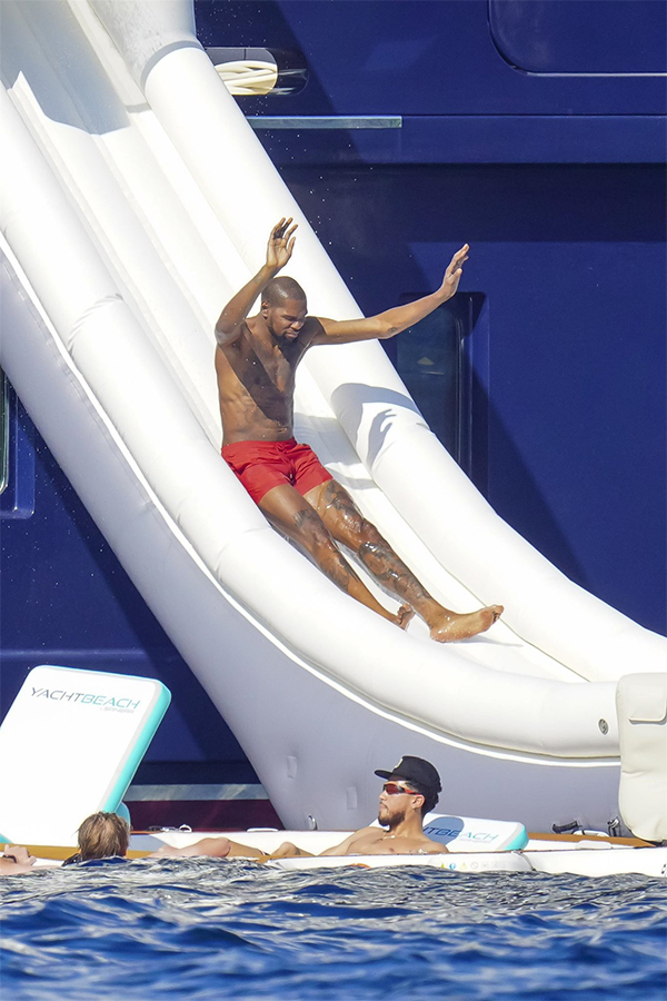 巴黎奥运会夺得金牌之后,杜兰特与布克一起乘坐游艇出海度假,期间杜兰特赤裸上半身,只穿着红短裤玩滑梯的画面引热议,如今谈到此事,杜兰特表示:哦,他们在错误的时间偷拍到了我……我当时是双手扶着滑梯上方的横杆,然后就那么的滑下来了……那是个很好玩的滑梯,不过后来我看到在网上火了之后,我第一时间想的是,谁TM的在大海中间还能用长镜头偷拍到这种照片啊?不过我给这个摄影师Respect。