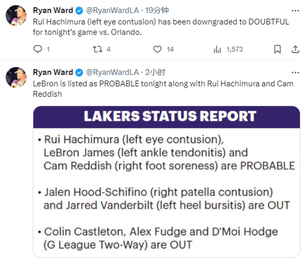 湖人官方公布对阵魔术的伤病报告——詹姆斯(左脚踝肌腱炎)、雷迪什(右脚酸痛)大概率出战(75%出场可能);八村垒 (左眼挫伤) 大概率缺席,25%的出战可能性,出战状态从大概率出战调整为小概率出战。