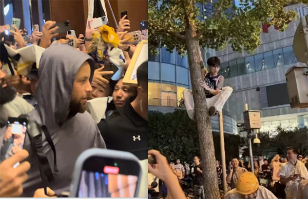 库里是昨天下午4点左右飞抵上海,下了飞机就开直播并且火速下播,之后库里转机飞到成都,在成都瑞吉酒店外聚集了无数球迷,里三层外三层全是人,为了看到自己的偶像库里,有球迷甚至爬树以及站在公交车顶棚上。