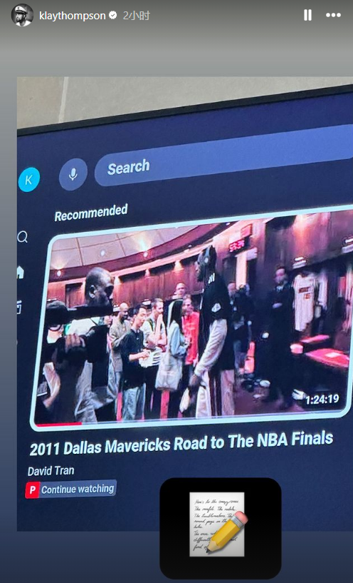 汤普森晒出的第一张照片是2011年独行侠(当时还叫小牛)夺冠之路的视频,配上记笔记的表情。
