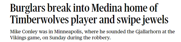 据当地警方发言人表示,在当地时间上周日,在康利为同城球队NFL明尼苏达维京人队吹响比赛号角的前几个小时,他的住宅在下午三点左右被盗贼闯入,据悉至少有两名嫌疑人参与了盗窃,而且当天发生了三起盗窃案,在每一起案件中,窃贼都带走了数量尚未确定的珠宝,目前盗贼还没有被逮捕。