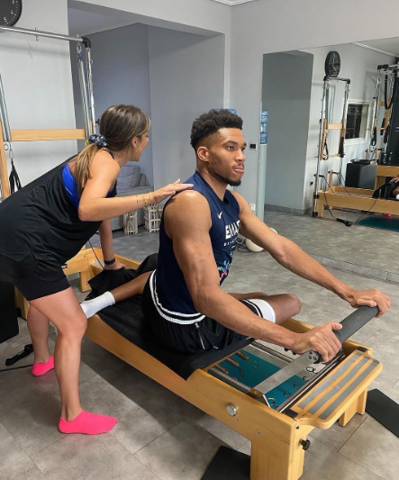 字母哥苦练普拉提曝光,美女训练师助力,空中倒挂太拼命