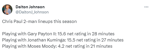 据勇士记者Dalton Johnson统计,保罗本赛季和佩顿一起打了28分钟,净效率15.6;与库明加一起打了27分钟,净效率15.5;与穆迪一起打了21分钟,净效率4.2;这应该就是科尔让保罗带领第二阵容的最大原因。