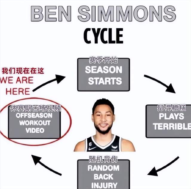 这个公式有4个环节,首先是休赛期的训练视频,第二是赛季开始,第三是打得糟糕,第四是随机出现背伤,然后开始新一轮的循环往复。在过去的几个赛季,西蒙斯都是在这样的情况下度过的。上赛季,西蒙斯就是在赛季开始前信誓旦旦,表示自己的身体已经完全恢复。结果,赛季只打了15场,西蒙斯便报销。