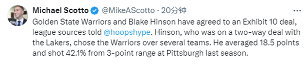 据名记Michael Scotto报道,勇士已经同意与布雷克-辛森签下一份Exhibit 10合同;辛森是今年落选秀,今夏与湖人签下了2年的双向合同,可此前湖人为了签下中锋科洛克,辛森被裁掉。