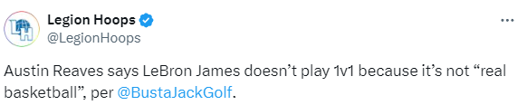 来源:JRS直播网09-21 11:15JRS直播网讯 北京时间9月21日,美媒Legion Hoops报道,湖人新星奥斯汀-里夫斯在参加高尔夫活动时谈到单挑,里夫斯爆詹姆斯从来不打单挑,因为他觉得那不是真正的篮球。