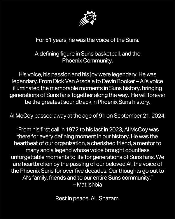 太阳官方发布讣告——称51年来,阿尔-麦考伊是太阳队的声音。他是太阳篮球和菲尼克斯社区的标志性人物。他的声音、他的激情和他的喜悦都堪称传奇,他本身就是传奇。从迪克-范阿斯代尔到德文-布克——艾尔的声音照亮了太阳历史中的每一个难忘时刻,在这个过程中将几代太阳球迷凝聚在一起。他将永远是菲尼克斯太阳队历史上最伟大的配乐。