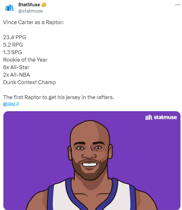 据猛龙记者Josh Lewenberg报道,猛龙队将在24-25赛季11月3日主场对阵国王的比赛中,退役队史名宿文斯-卡特的15号球衣!