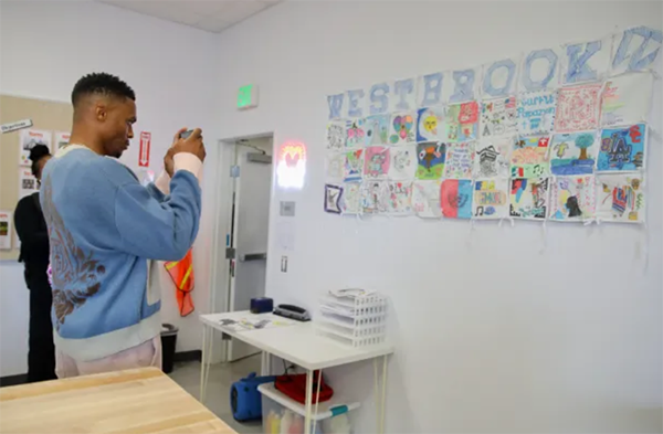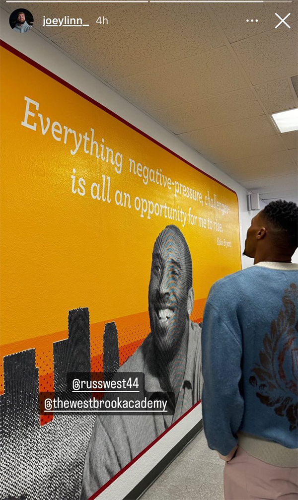 威少参观了这个新校区,期间威少掏出手机拍摄贴满学生作品的绘画墙,上面写着威斯布鲁克;威少还仰望印有科比名言的壁画,上面写着科比的名言——一切负面的事件、压力和挑战,都是让我崛起的机会。