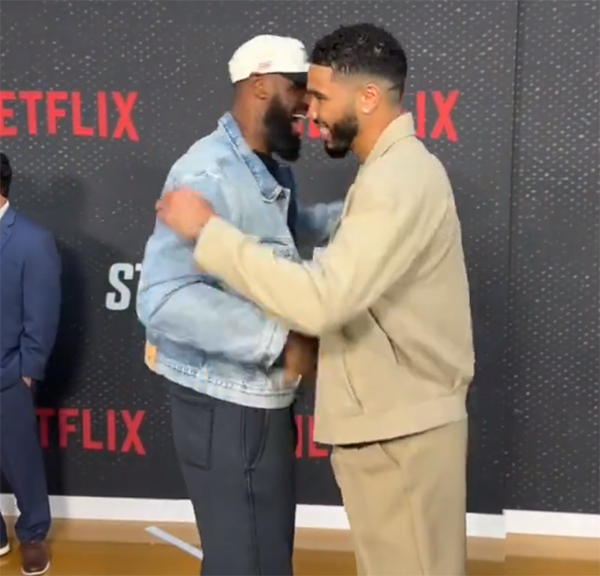 39的詹姆斯身穿长裤和牛仔外套、戴着白色棒球帽参加《Starting 5》首映礼,现场的球迷为他欢呼呐喊;爱德华兹身穿宽松连帽卫衣,巴特勒戴着墨镜并且身穿潮流短袖,萨博尼斯和塔图姆都身穿西装出席活动。