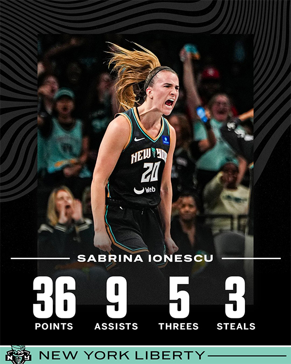 来源:JRS直播网09-25 11:58JRS直播网讯 北京时间9月25日,WNBA季后赛首轮G2,纽约自由人91-82击败亚特兰大梦想,大比分2-0横扫晋级半决赛,被称为“女库里”的约内斯库大爆发,全场出战39分钟,23投12中、三分11中5、罚球7中7独砍36分9助攻3抢断,正负值+11,带队晋级半决赛。