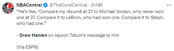 近日,塔图姆的训练师Drew Hanlen在ESPN的节目中透露,塔图姆和自己发短信时谈到了他生涯至今的履历,并与乔丹、詹姆斯、库里进行了比较,Hanlen表示:他(塔图姆)当时说的是‘看看我到27岁的履历吧,和乔丹比,他27岁还没拿过冠军。和詹姆斯比,他拿了一个,和库里比,他也拿了一个。’