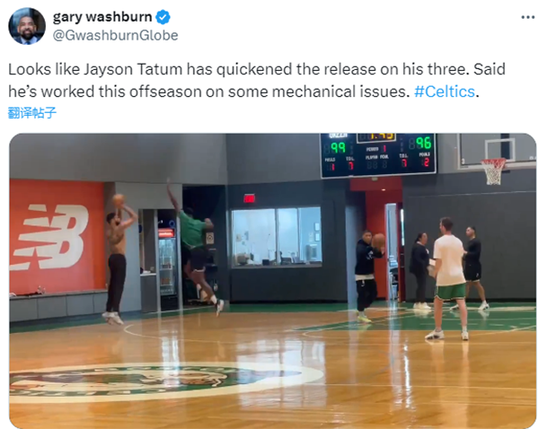今年休赛期,塔图姆在训练师Drew Hanlen的指导下,解决自己投篮机械的问题,现在塔图姆的投篮更快更流畅了,绿军记者晒出塔图姆的训练视频,表示看起来塔图姆加快了三分球的出手速度,他说他在休赛期已经解决了一些机械问题。